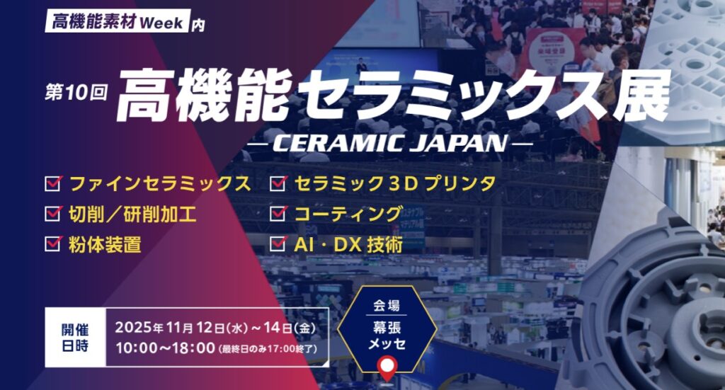 このたび、11月12日(水)~14日(金)までの3日間、幕張メッセで開催されます高機能素材Week内の『第10回 高機能セラミックス展・CERAMIC JAPAN』へ出展することになりました。